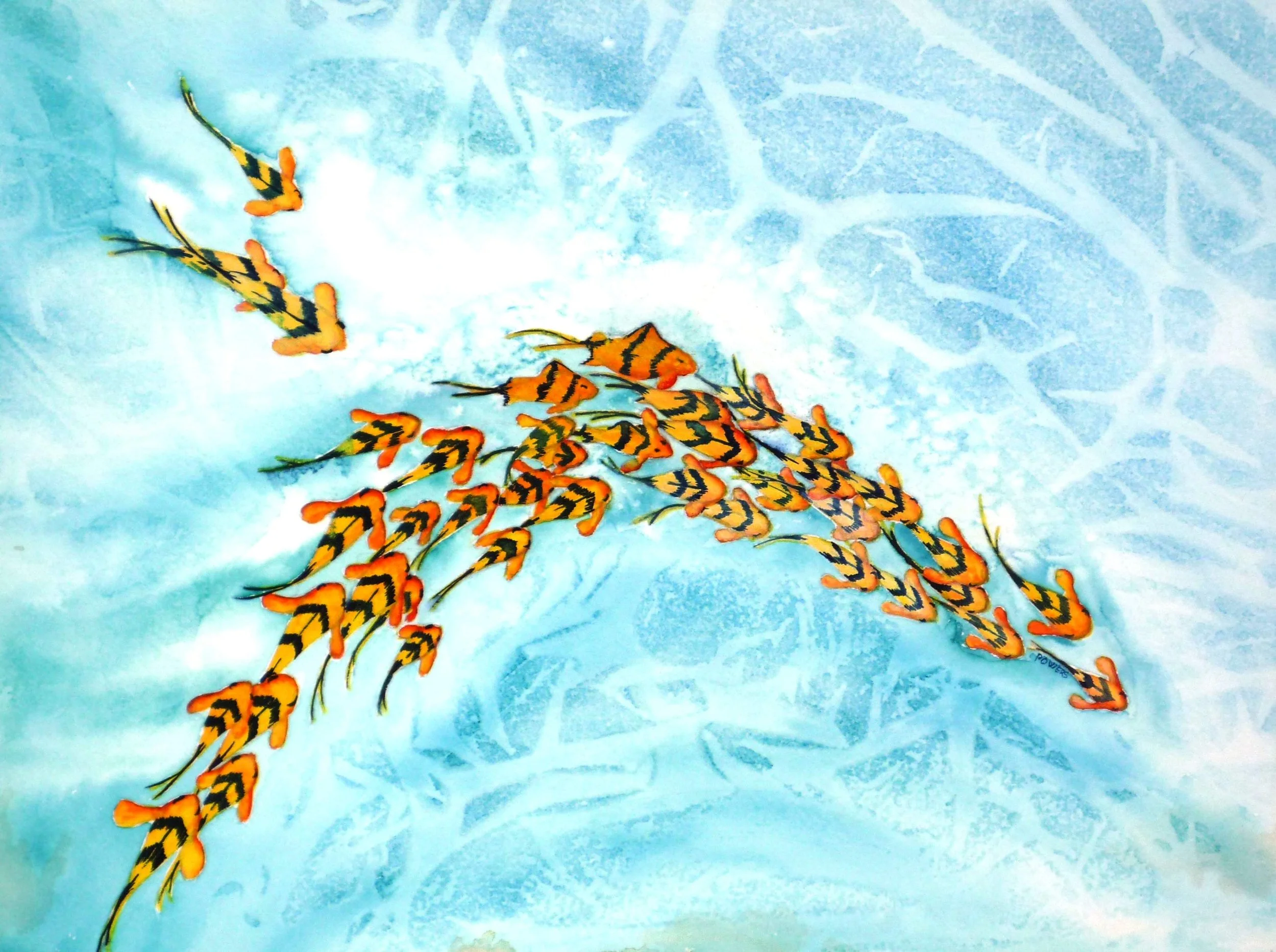 She enjoys workshops and always has work on her easel. Her studio space in her home is small and includes a North window. She is married, has two dogs, tropical fish, a cat, and a house full of plants. She loves her gardens, and they are a source of inspiration.